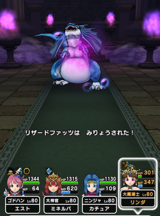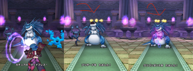 ニンジャに八竜神の剣を持たせてファッツの初ターンを毒息のみにして、グリゴンダンスに縛り打ち。ケキちゃん・水晶でバフった雨雲の杖のざざん波で攻撃。2ターン目にファッツを麻痺させたら3ターン目はリーザスゼシカに交代してテンションブースト。後は麻痺が解けたら縛り打ち。
