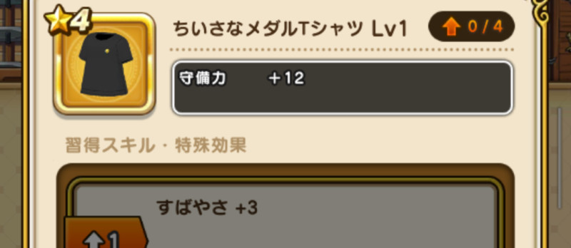 ドラクエウォークの防具「ちいさなメダルTシャツ」の評価や習得スキル・特殊効果をまとめています。