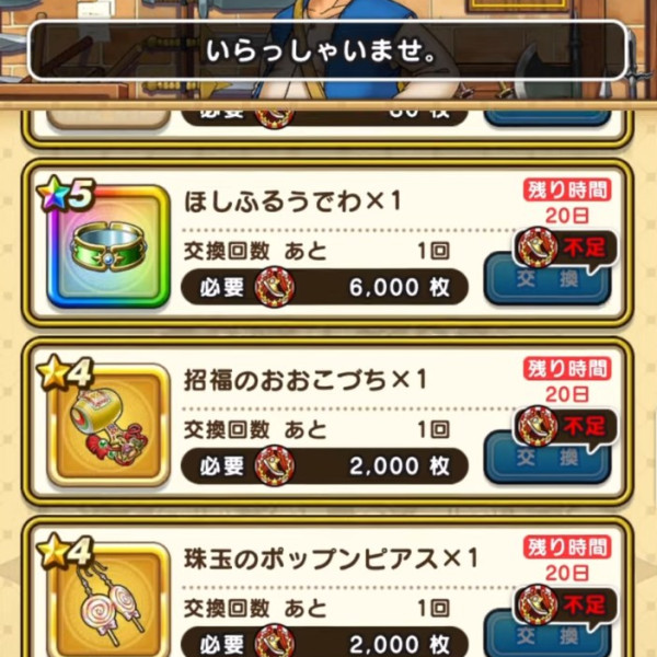 1つにつき、メダル2000枚で交換(★5は6000枚)