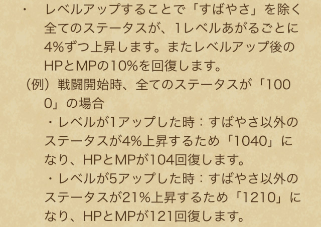 戦闘開始時に領域「レベルアップ」発動(????系の敵なら超越領域に変化) 味方のレベルを戦闘中に確率で上げ 一部を除くステータスが上昇【いきなり】