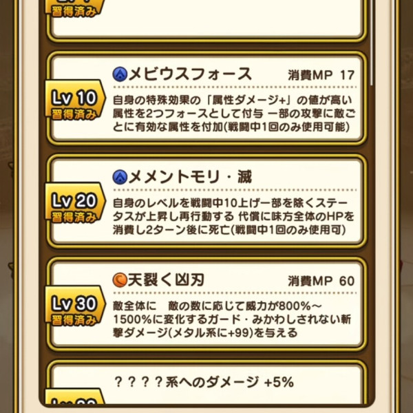 | └ | 全体 800~1500%必中斬撃 + メタル系+99ダメ(威力は敵の出現数で変化する) |