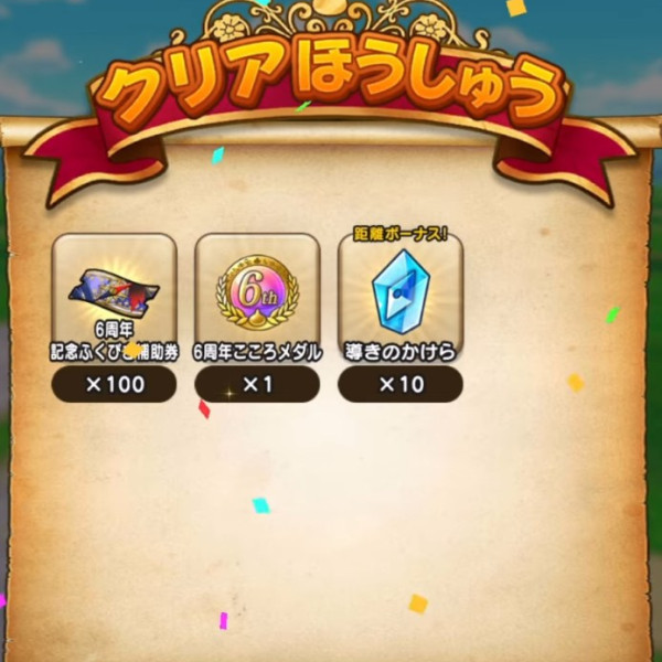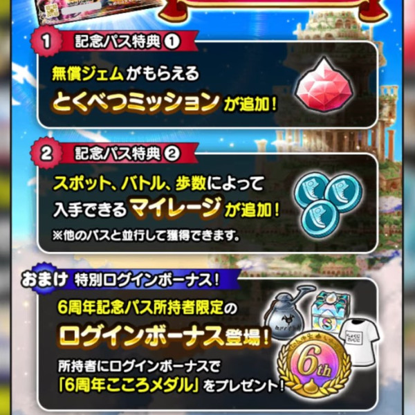 無償ジェムがもらえる特別ミッションのほか、特別ログインボーナスで6周年こころメダルをもらえます。