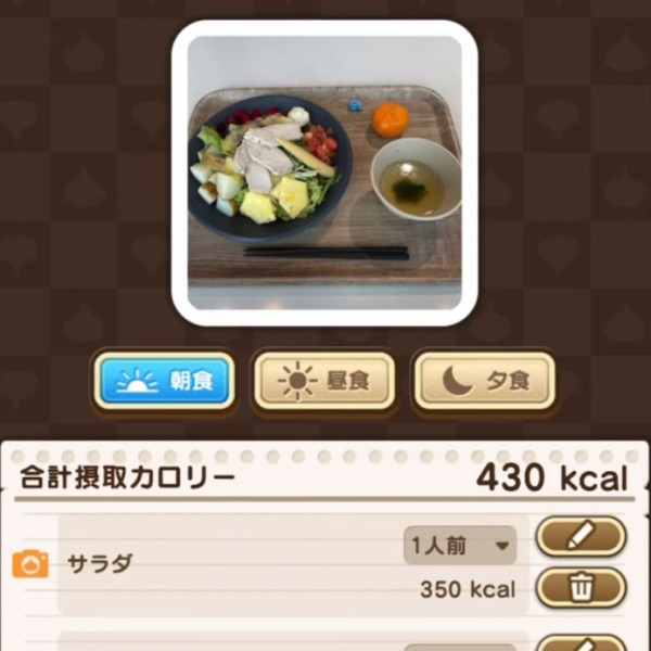 睡眠に続き、食事を管理することのできる新コンテンツです。食べた食事を撮るとAIが解析し、カロリーが表示されます。近い料理を選択することで記録もされます。