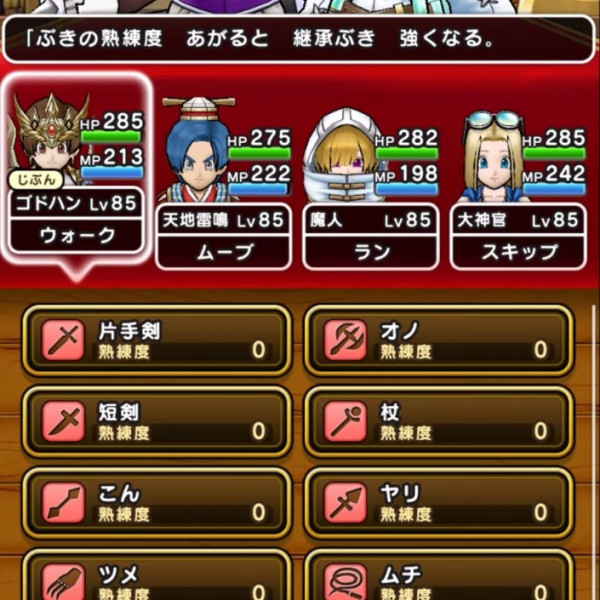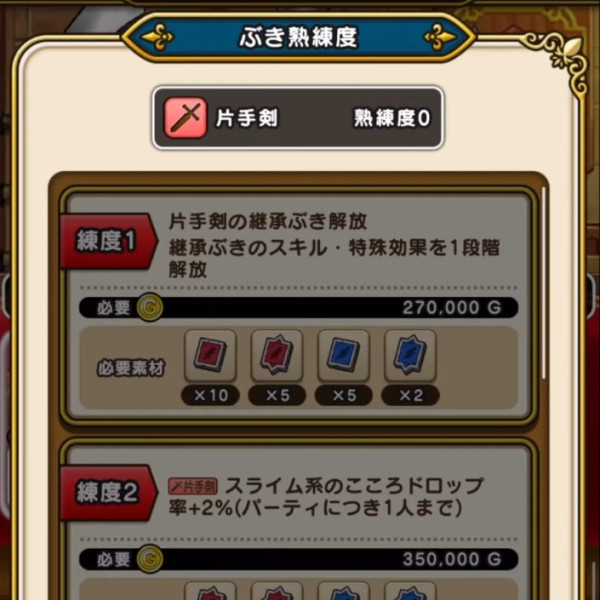 ぶき種毎に熟練度が追加されます。熟練度を上げることで継承ぶきの強化やこころドロップ率UP・ステータスUP等の効果を得ることができるようです。石板はほこらと同じよう。