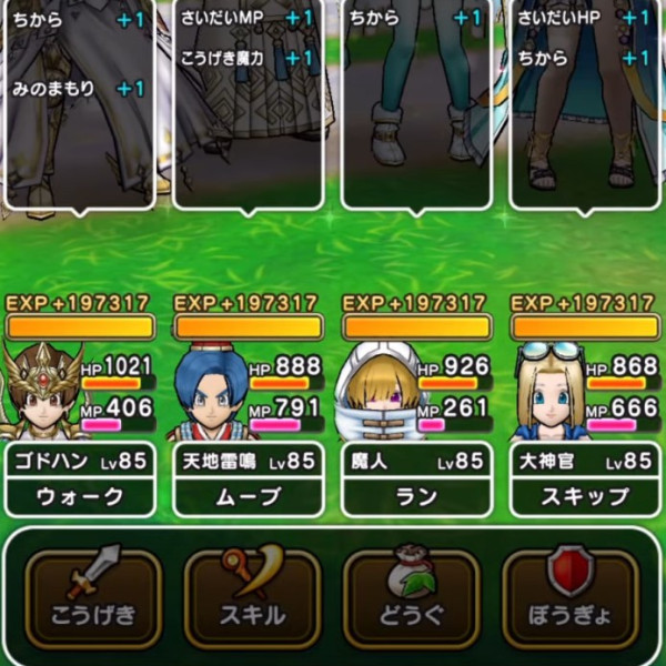 ![]() | 【プチ解説】 戦闘中のレベルアップは1UP毎に全ステ+4% (すばやさを除く、レベルアップ時にHPとMPが10回復する) |