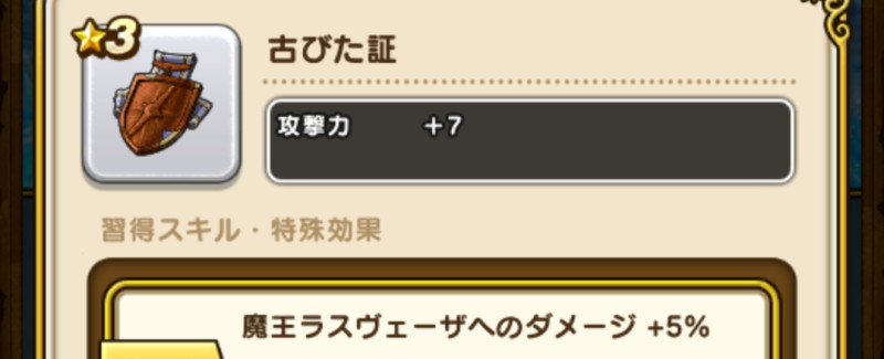 ドラクエウォークの防具「古びた証」の評価や習得スキル・特殊効果をまとめています。