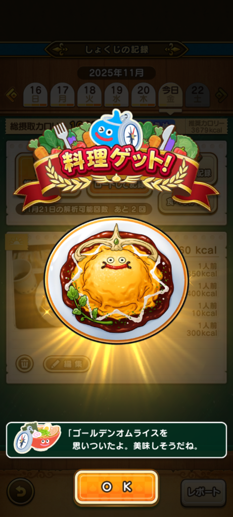 ゴールデンスライム型になるのは一週間の食事のカロリーが1日のうちの朝の食事で片寄って多くしたらなるっぽいですね。朝700kcal昼夜300kcalくらいにしてたらなりました