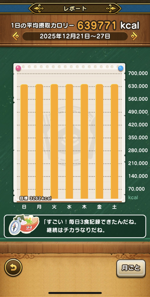 | 振り返り | 毎週日曜0:00~土曜日23:59までの1週間 ※最低1食分の「料理」記録が必要 |