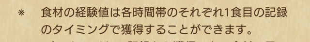 食材の経験値の獲得は、当日の記録のみとなります。前日に食事を登録しても獲得できません。また、朝/夕/夜のそれぞれ1食目だけ経験値を獲得できる可能性があります。