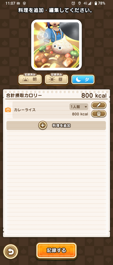 ⑤食後、忘れてもいいが、編集を使って実際に食べたものに変えておく(exp変化なし)