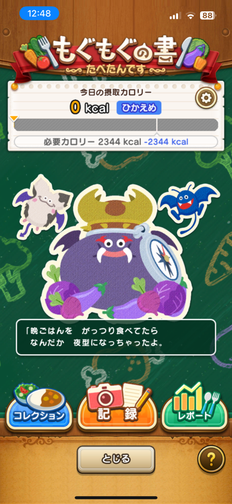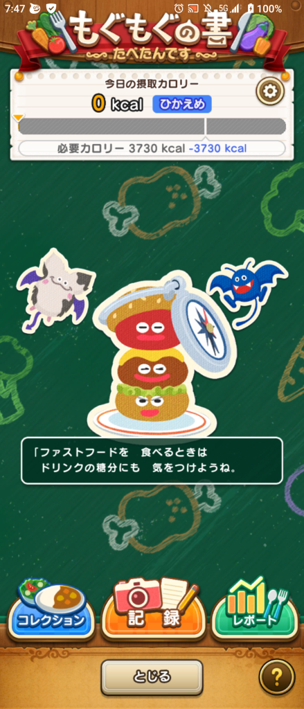 12日から19日昼まで試しの3回以外は全部テキスト記録で、19日夜から20日全部記録し忘れで21日朝チェックしたらスライムプディングに変化して2500貰えてた。7日3食記録しようのミッション5/7でクリア出来ずになってます。