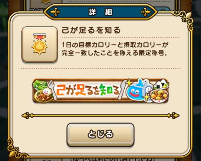シークレット称号のニアピンとピタリですが、自分で料理を適当に追加してカロリーを合わせれば取得できました