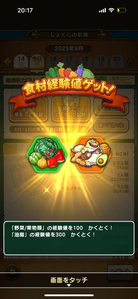記録を続けて食材経験値を貯めると、レベルが上昇し報酬が手に入ります。