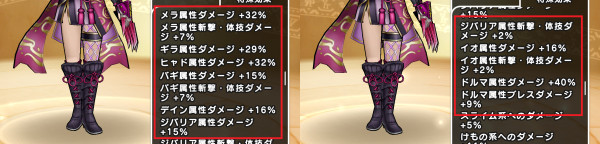 | 【付与属性選択時】 ※「◯◯属性ダメージ+」「◯◯属性斬撃・体技ダメージ+」を参照する ※「◯◯属性じゅもんダメージ+」「◯◯属性ブレスダメージ+」も参照する ★宝の地図の地形効果も参照する(後述) 【ダメージ計算時】 ※斬撃スキル使用時は「◯◯属性斬撃・体技ダメージ+」も参照する ※斬撃スキル使用時は「◯◯属性じゅもんダメージ+」を参照しない ※斬撃スキル使用時は「◯◯属性ブレスダメージ+」を参照しない | |||