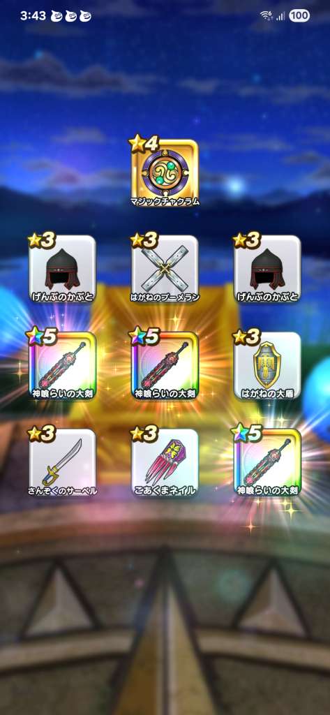 ![]() 女神セレシアのつるぎ | ![]() あまぐもの杖 | ![]() グリザードの鋭牙 |