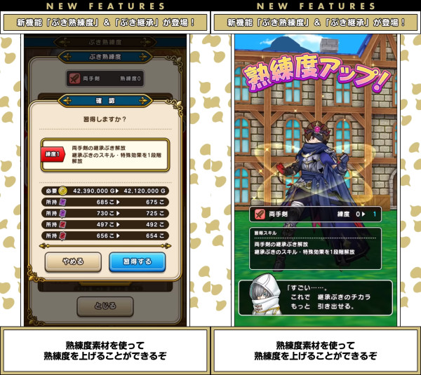 ドラクエウォークの6周年新機能「ぶき熟練度(武器熟練度/ぶき継承)」をまとめています。ぶき熟練度で習得できる効果なども掲載していますので、参考にしてみてください。