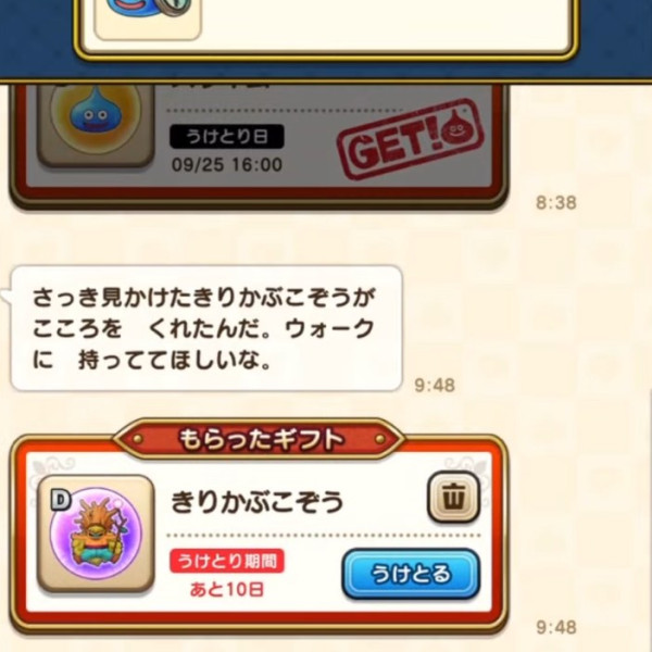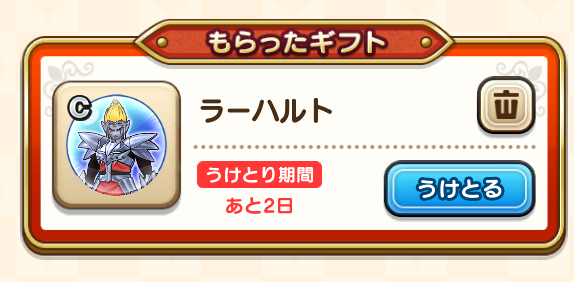 | └ | ここで「うけとる」を選択すると受け取れる |
