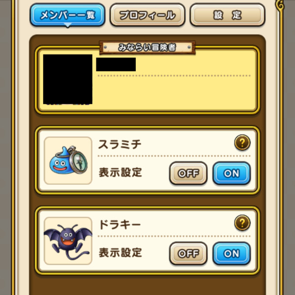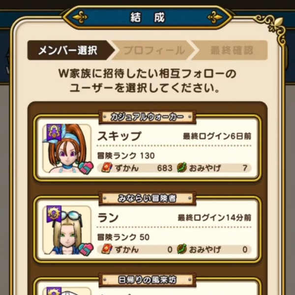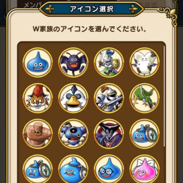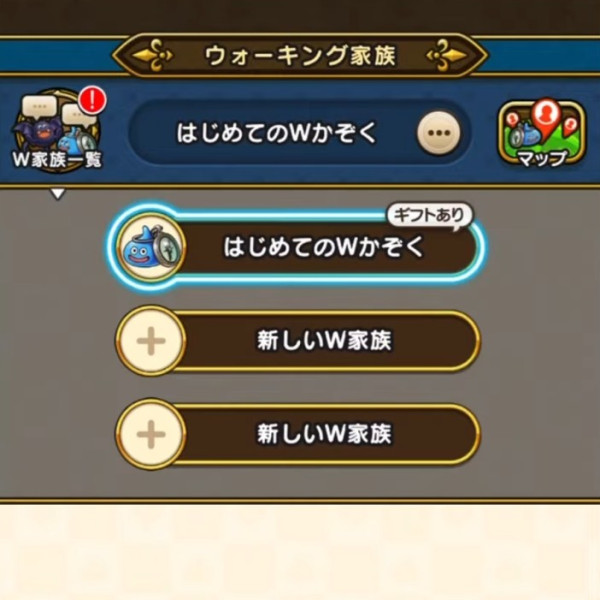ソロでは最初からスラミチとドラキーが参加してくれています。名前は「はじめてのWかぞく」、アイコンは「スラミチ」で初期設定。