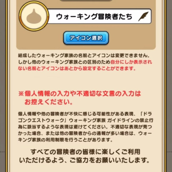 | ※結成後に変更はできない。 ※自分だけに表示される名前・アイコンは再設定可能。 ※個人情報の入力、不適切な文言は控える。 ※通報機能もあり、通報が多い場合は利用制限することも。 |