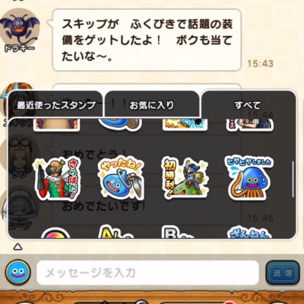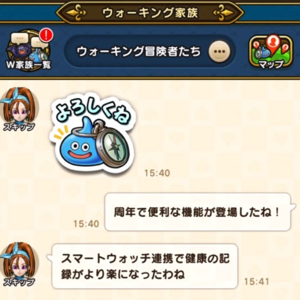 W家族とのメンバーとチャット機能が楽しめます。スタンプも使えたり、たまにドラキーやスラミチが会話に参加したりすることもあります。