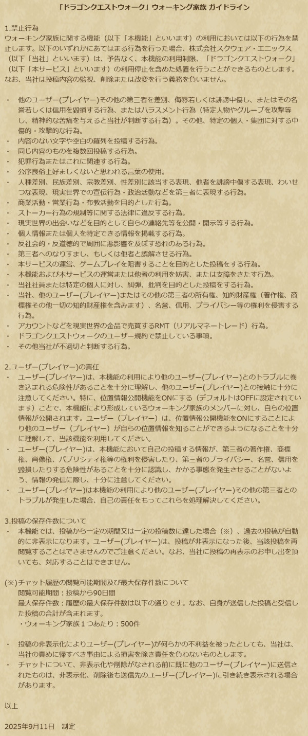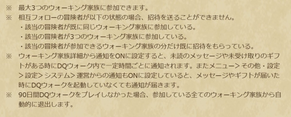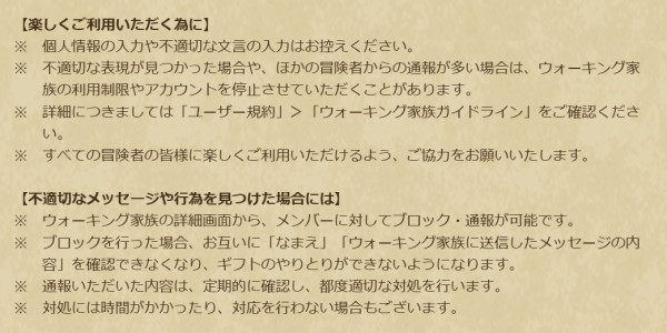 | ※数字や一部の言葉・文字、対応していない記号や絵文字を使用すると「*」に変換。 ※ウォーキング家族に参加した後に送信されたメッセージのみ確認。 ※一度家族から退出し、再参加した場合も同様。 ※ウォーキング家族を脱退したメンバーがいた場合、メッセージは残る。 ※冒険者のアイコンおよび名前は残らない。 |