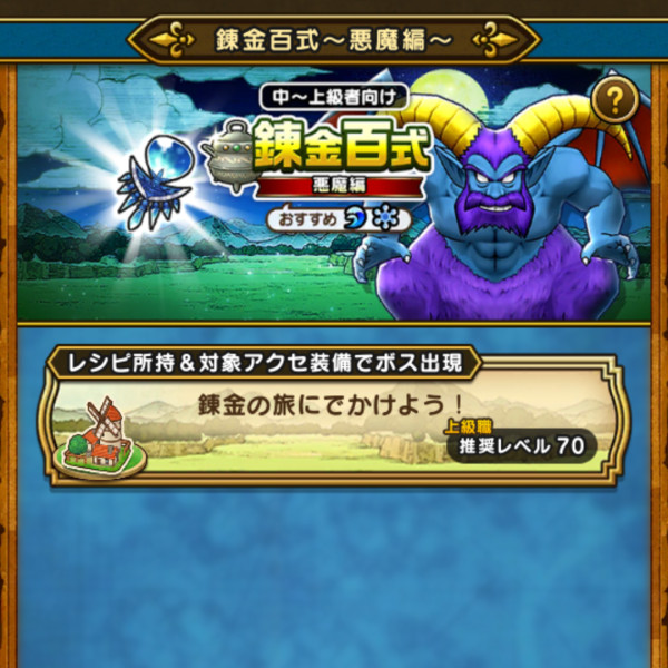 初心者の方は悪魔だけが出現する、錬金百式の「悪魔編」が達成しやすいと思います。頭上に「ボス」と表記されている方ではなく、フィールドのザコモンスターです。ほか、宝の地図のバアルゼブブ大量発生でも。