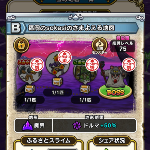 宝の地図のお宝モンスターを数匹倒すと見つかるかも 「お宝モンスター」は地図のボスの左に表示されている3種類のこと 筆者は3体で入手 |