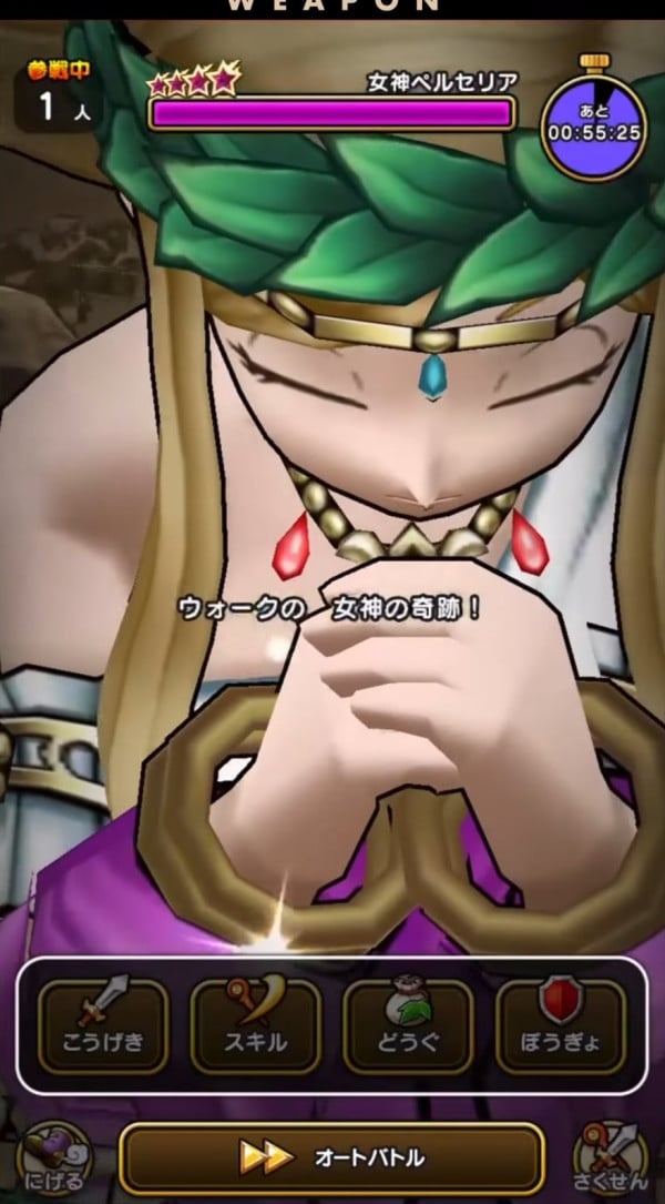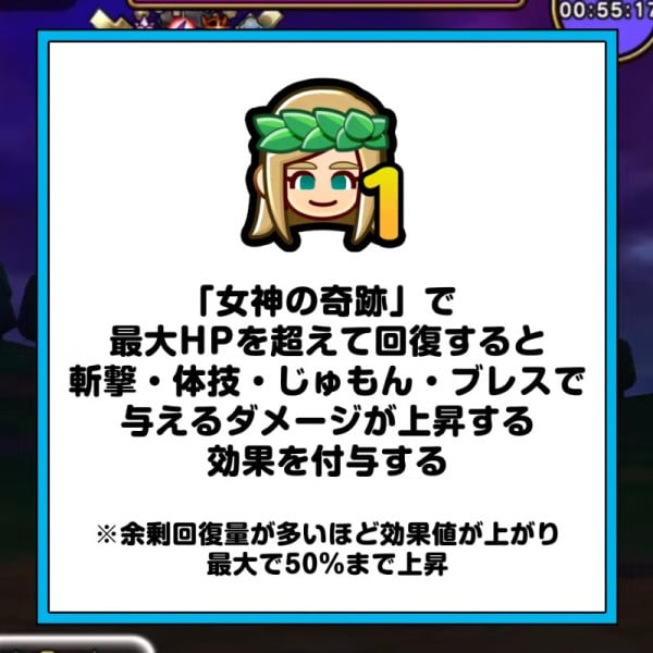 | 練度1 | 女神の奇跡 / 消費MP 70 呪文で仲間全員のHPを回復する 最大HPを超えて回復した場合 余剰回復量に応じて与えるダメージが上昇する効果を付与 |