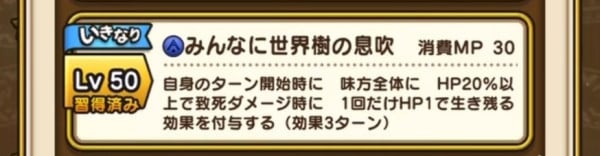 | Lv50 | みんなに世界樹の息吹 / 消費MP 30 自身のターン開始時に 味方全体に HP20%以上で致死ダメージ時に 1回だけHP1で生き残る効果を付与する(効果3ターン)【いきなり】 |