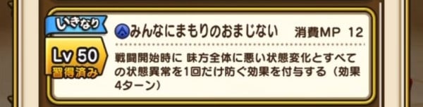 | Lv50 | みんなにまもりのおまじない / 消費MP 12 戦闘開始時に 味方全体に悪い状態変化とすべての状態異常を1回だけ防ぐ効果を付与する(効果4ターン)【いきなり】 |