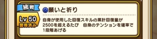 | Lv50 | 願いと祈り / 消費MP 10 自身が使用した回復スキルの累計回復量が2500を超えるたび 自身のテンションを確率で1段階あげる【挑戦】 |