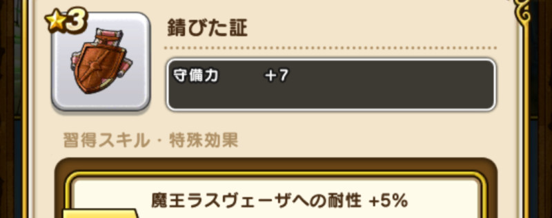 ドラクエウォークの防具「錆びた証」の評価や習得スキル・特殊効果をまとめています。