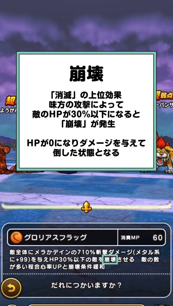 新要素「崩壊」は、「消滅」の上位効果です。消滅が15%以下に対して、崩壊は30%以下で敵を消し去ることができます。