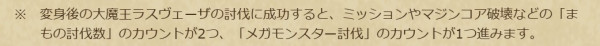 変身後の「神魔王ラスヴェーザ」まで討伐するとミッションやマジンコア破壊の「まもの討伐数」が2つ、「メガモン討伐」が1つ進みます。