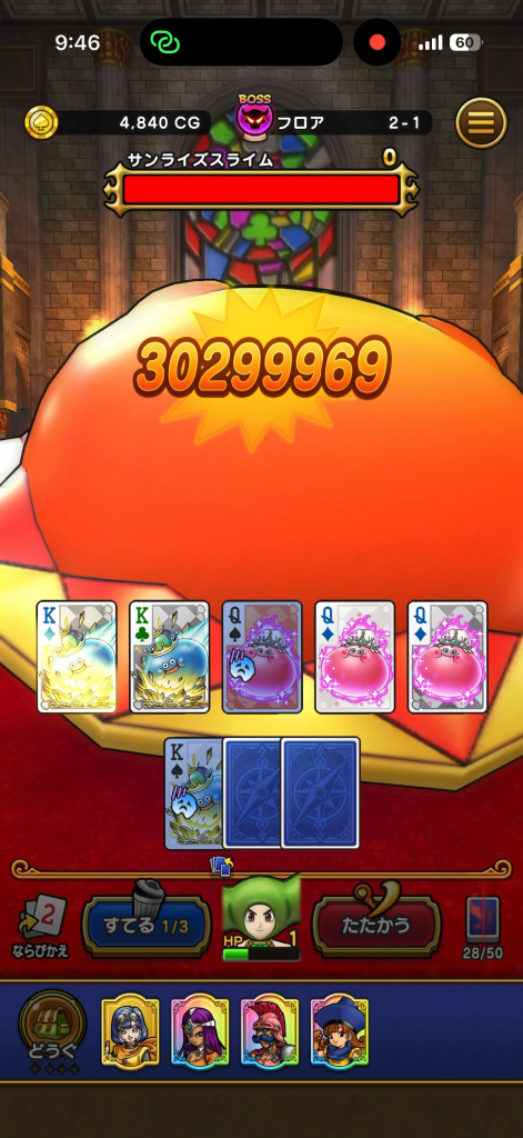 キノコと捨てるの後2回戦えば全カードめくれるので、4のフォーカードで1/4で討伐
