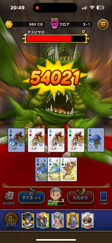 絵札初回2倍とスライム2倍、捨て0強化のコンボが組めたらフラッシュ攻めワンパン突破が可能。