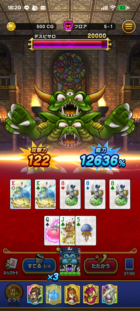 ドラぽか画面の下部「つよさをみる」から、各カードや各役のレベルや威力などを確認することができます。