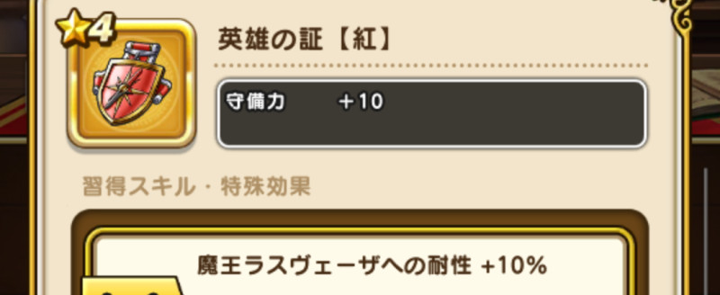 ドラクエウォークの防具「英雄の証【紅】」の評価や習得スキル・特殊効果をまとめています。