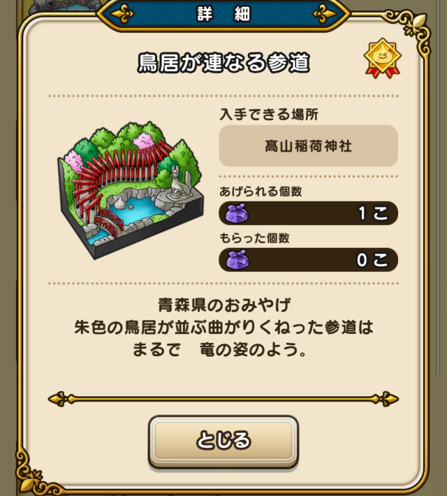 ドラクエウォークのランドマーク「髙山稲荷神社」で入手できるお土産「鳥居が連なる参道」や、髙山稲荷神社の場所をMAPで表示しています。GoogleMAPとも連携していますのでナビ等にもご利用いただけます。