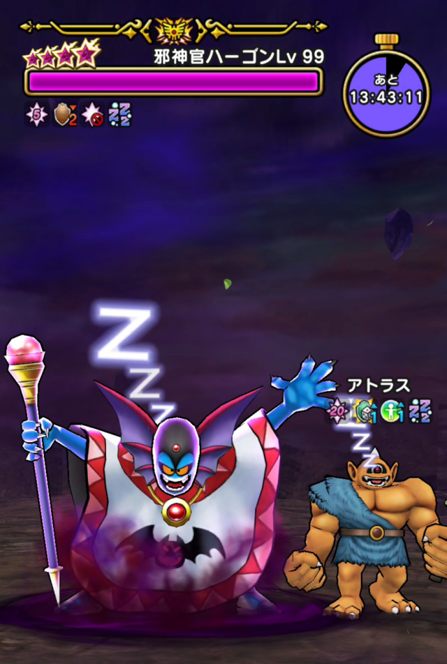 ニンジャに持たせて、装備(ピッコロや妖魔)やこころ(デスタムーア覚醒、キャプテンクロウ、ハーゴン覚醒(虹枠)、シャルマナ)、心珠で状態異常成功率を上げるとほぼ熟睡が入ります。たまに入らないことがありますが、敵の素早さも2段階下げるので(確定ではありませんが)、ケキちゃんやラーミアがあれば他の3人も先制で攻撃できます。