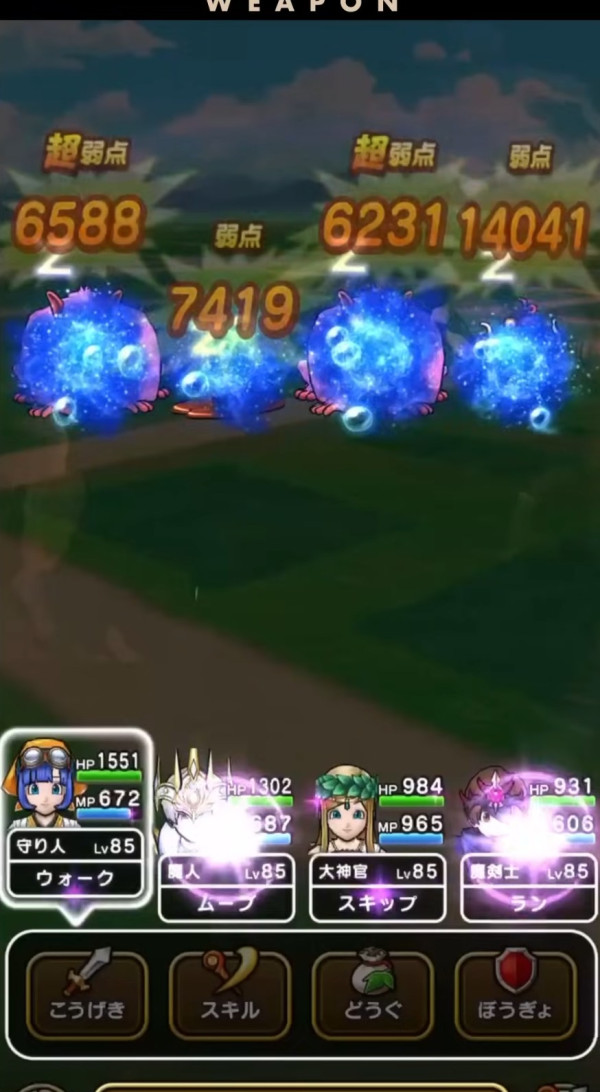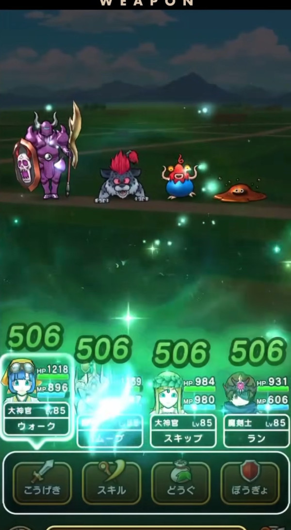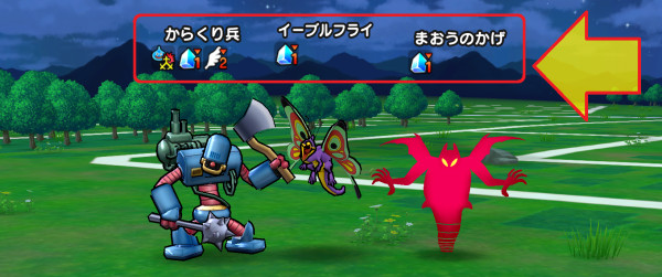 最低HPの敵にスライムが付着 対象が死亡時両隣の敵に体技ダメージを与え確率でふきとばす スライム系・セラフィのこころ装備で効果UP(効果6ターン)【いきなり】
