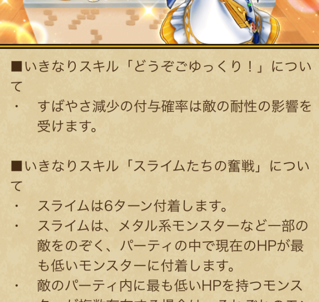 最低HPの敵にスライムが付着 対象が死亡時両隣の敵に体技ダメージを与え確率でふきとばす スライム系・セラフィのこころ装備で効果UP(効果6ターン)【いきなり】