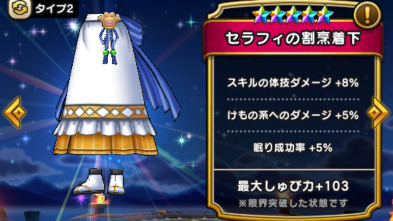 ドラクエウォークの防具「セラフィの割烹着下」の評価や習得スキル・特殊効果をまとめています。