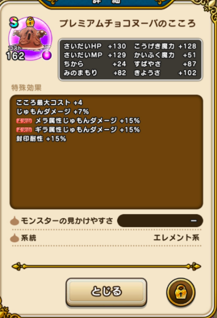 ドラクエウォークの「プレミアムチョコヌーバのこころ」の性能・ステータス順位、必要個数を掲載!心珠ポイントへの交換効率や出現場所などもまとめていますので参考にしてください。