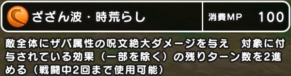 効果敵全体にザバ属性の呪文絶大ダメージを与え 対象に付与されている効果(一部を除く)の残りターン数を2進める