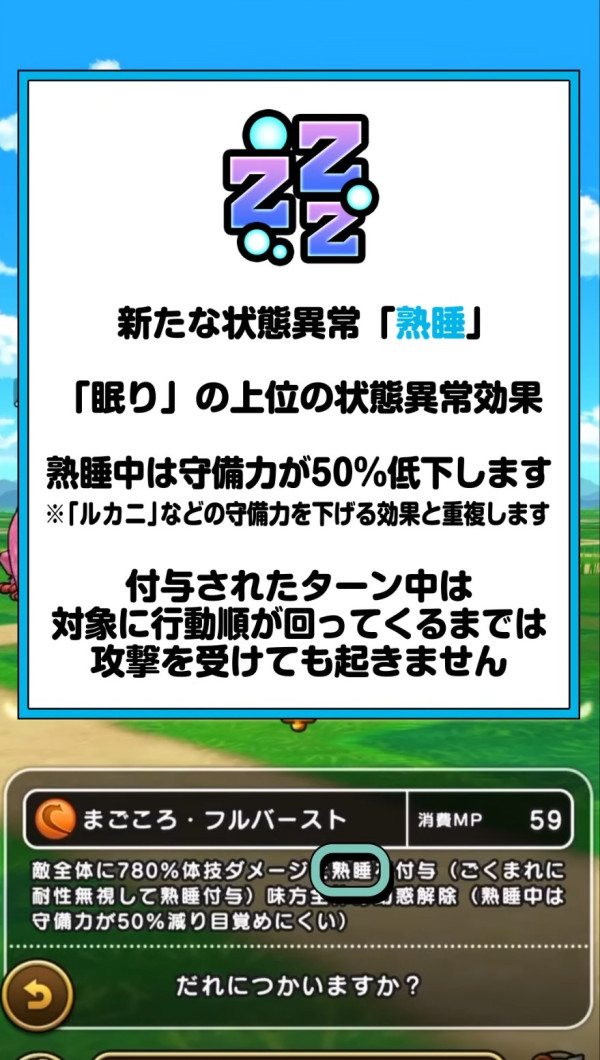 | ※耐性は「熟睡」と「眠り」で共通 ※「眠り」を解除する効果で「熟睡」も解除 ※「眠り」付与成功率アップの効果で「熟睡」付与成功率も上昇 ※「眠り」状態の敵に「熟睡」を上書き可(逆は不可) (上記の場合、効果ターンも上書き) ※ まどろむ災厄(エスタークの魔刃)で「熟睡」は防げない※「眠り」時に威力が上がる一部スキルは「熟睡」時に上がらない ( ヒュプノスハント、 フロストハントなど) |