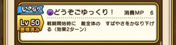 いきなりピオリム系は味方に効果があるものでしたが、今回はその逆になります。敵のすばやさを2段階低下でき、周回用ですが、成功率は各モンスターの耐性によって変化してしまいます。