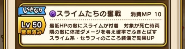 | 主に周回用のサポート向けの武器です。新要素「熟睡」は敵の守備力を50%ダウンして、そのターン行動できなくなります。さらに、いきなりスキルによりすばやさが2段階ダウンするため、実質プレイヤー側のすばやさが+51%相当上昇します。さらに、「スライムたちの奮戦」はHPが低い的に「スライム」が付着し、倒れた時に両脇にダメージ+確率で「ふきとばし」が入ります。火力役ではなく、周回ですばやさの調整に困っている方や、グリザードの鋭牙を未所持の方、新しい魔界の香水用で欲しい方に向けた性能です。 | ||