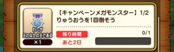 記念大王スライム系と同様の仕様で、手形が必要のない「キャンペーンメガモン」となります。倒すとミッションから限定称号(テキスト)が入手できる以外の報酬はありません。