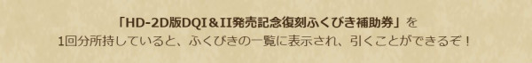 ![]() | HD-2D版DQⅠ&Ⅱ発売記念復刻ふくびき補助券×100枚 発売記念スポットミッション:100枚 |